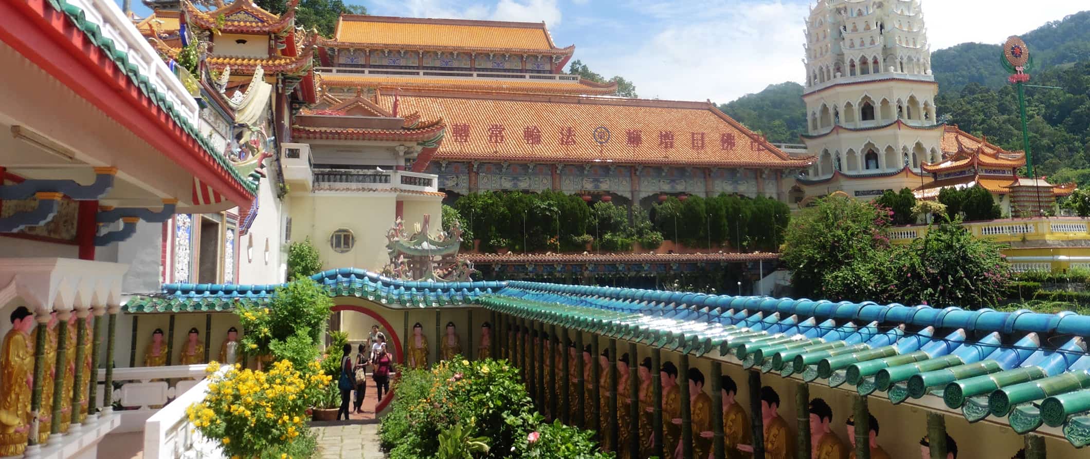 Colorful historic temples in Malaysia on a sunny day with rolling green hills in the background