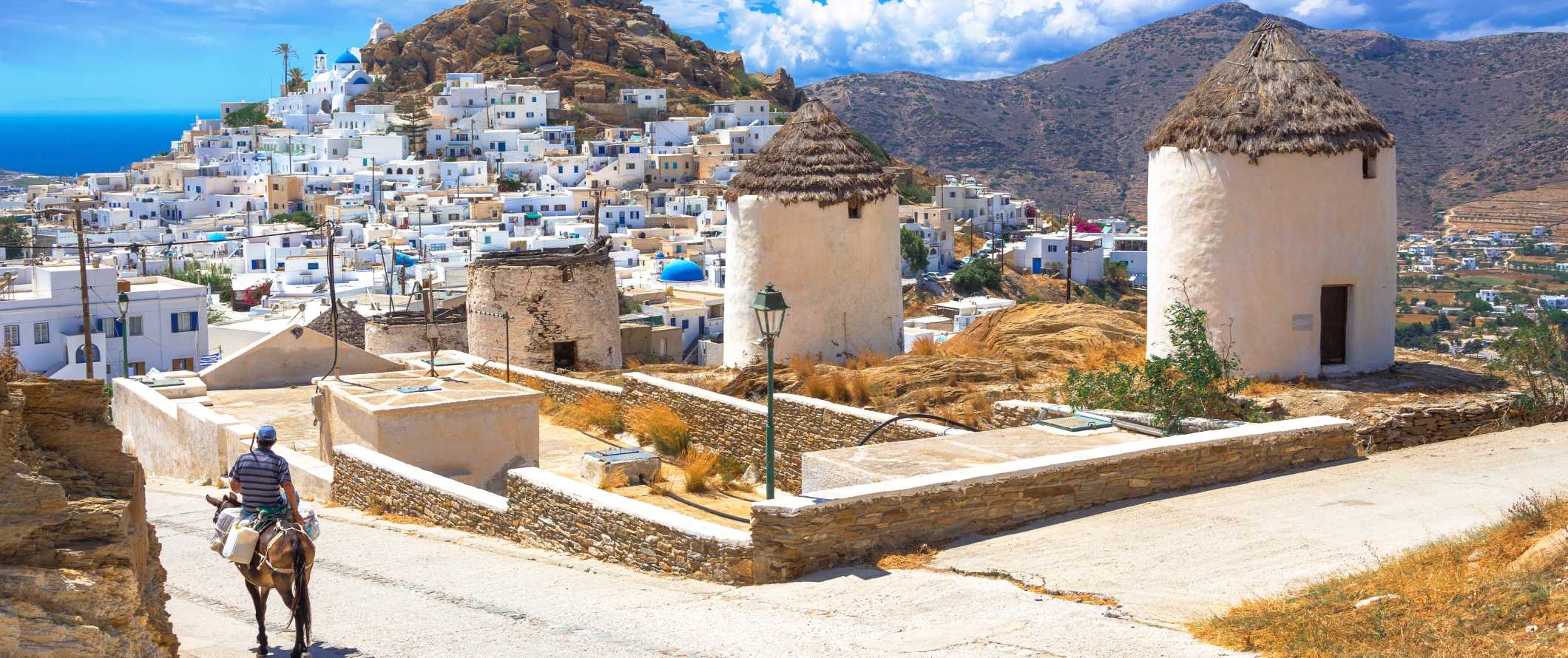 View of Chora with white-washed houses, windmills in the foreground, and a man riding a donkey down the road in Ios, Greece